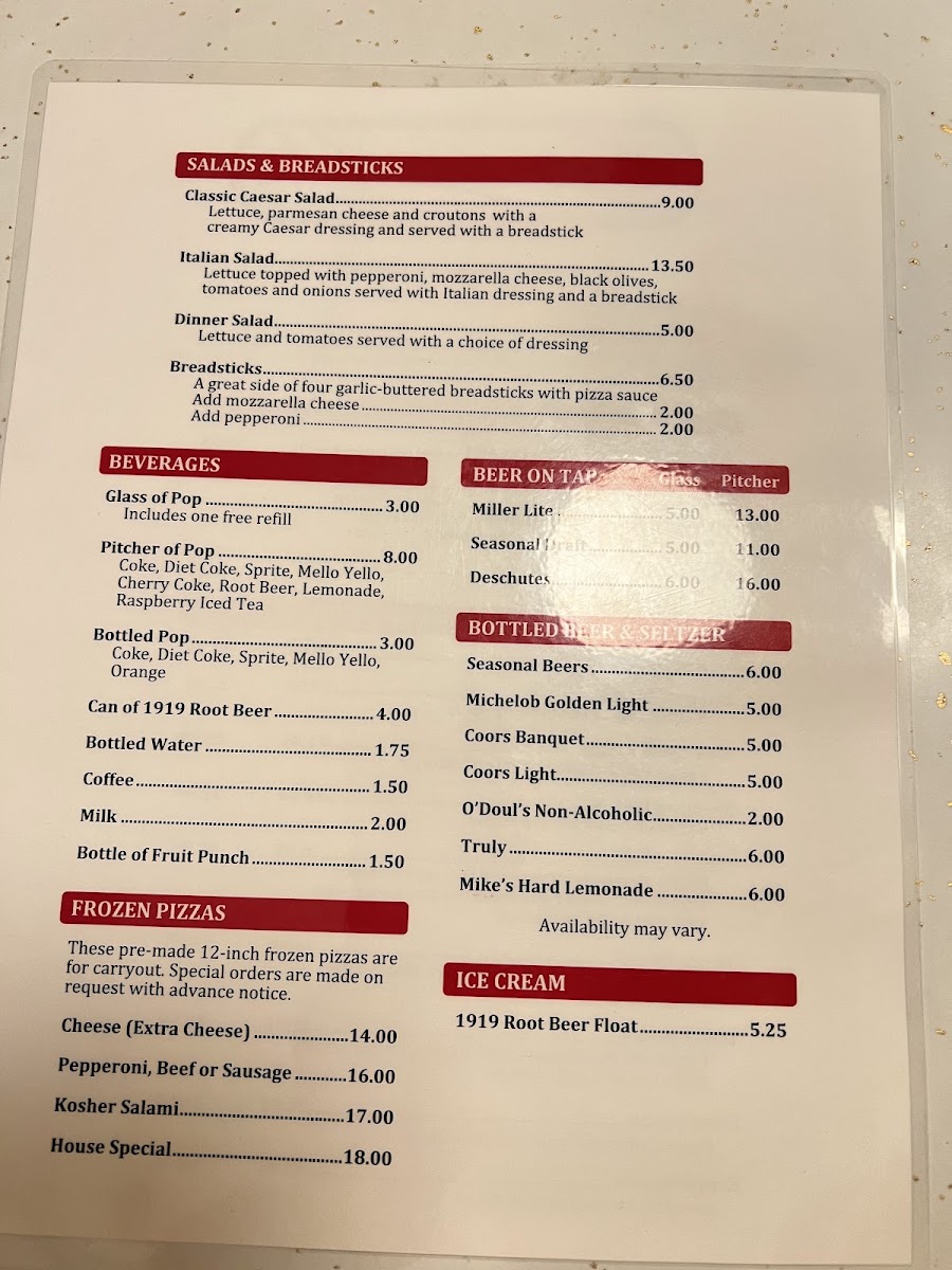 Guests can enjoy signature choices like the hearty sausage and pepperoni pizza or the distinctive Canadian bacon and sauerkraut pie. Alongside these, simple sides such as fresh salads and warm breadsticks complement the main dishes, creating a balanced and approachable meal. The drink selection includes both refreshing sodas and seasonal beers, which pair naturally with the relaxed, down-to-earth atmosphere of the restaurant.